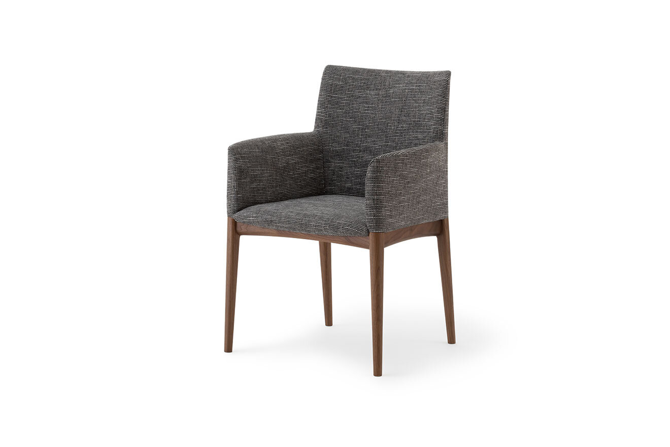 座から肘、背にかけて優雅な曲面を纏う椅子です。張りの下端のくびれは外に張り出した肘や背へと続き、管楽器のように滑らかな曲面を作り出します。 イストクが培った張りの技が生む薄く柔らかな背と肘が身体に優しく寄り添います。樹種
