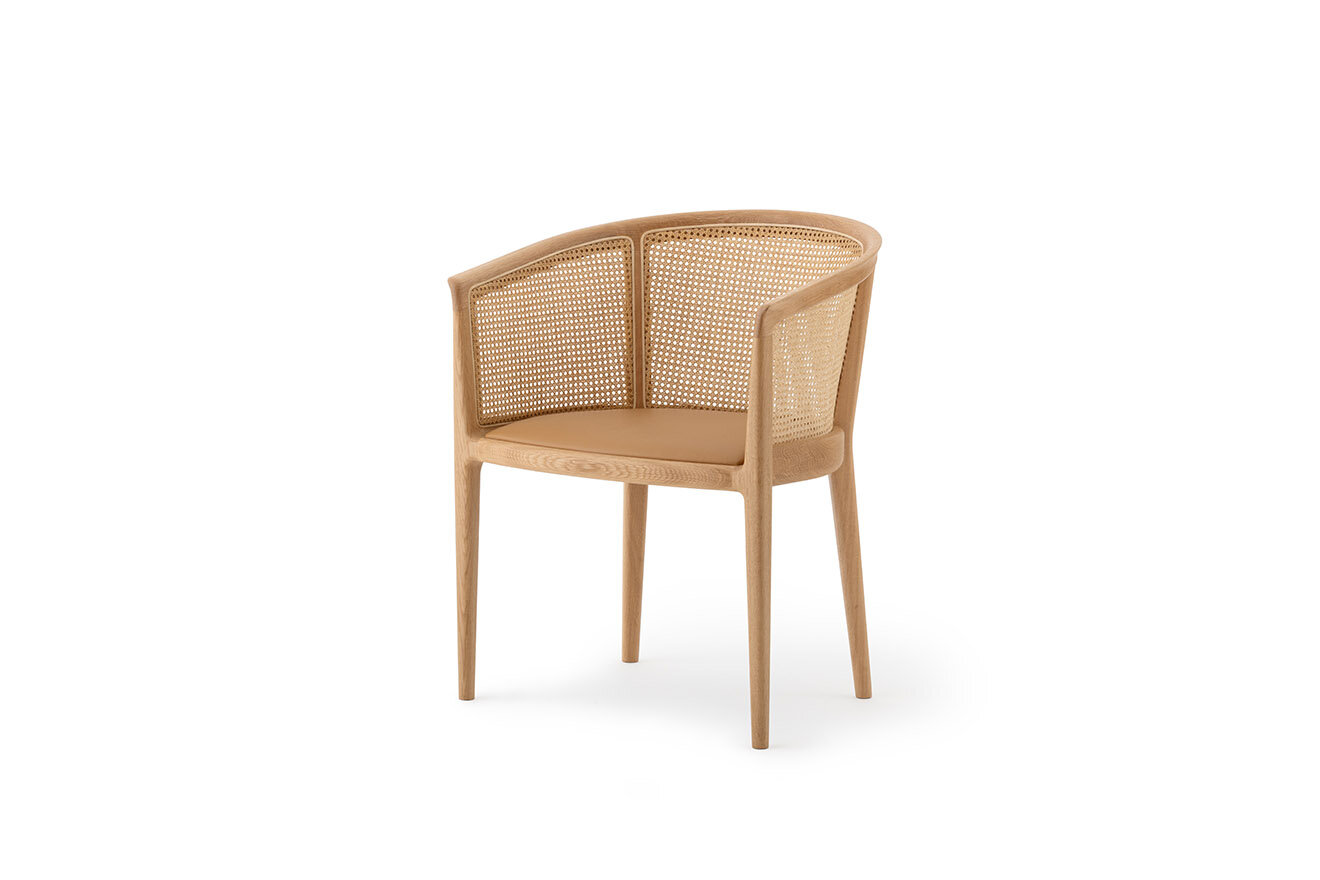 クラシカルな馬蹄形が醸し出す品格と、今の空間に馴染む軽さを備えた椅子です。 一本の無垢を曲げた笠木はエッジを立ててくびれ、ミンクのようにしなやかな弧を描きます。 異素材の組み合わせから肘張り、クッション性の有無など多彩なバリエーションを選べながら、セッ トで調和するシリーズです。樹種